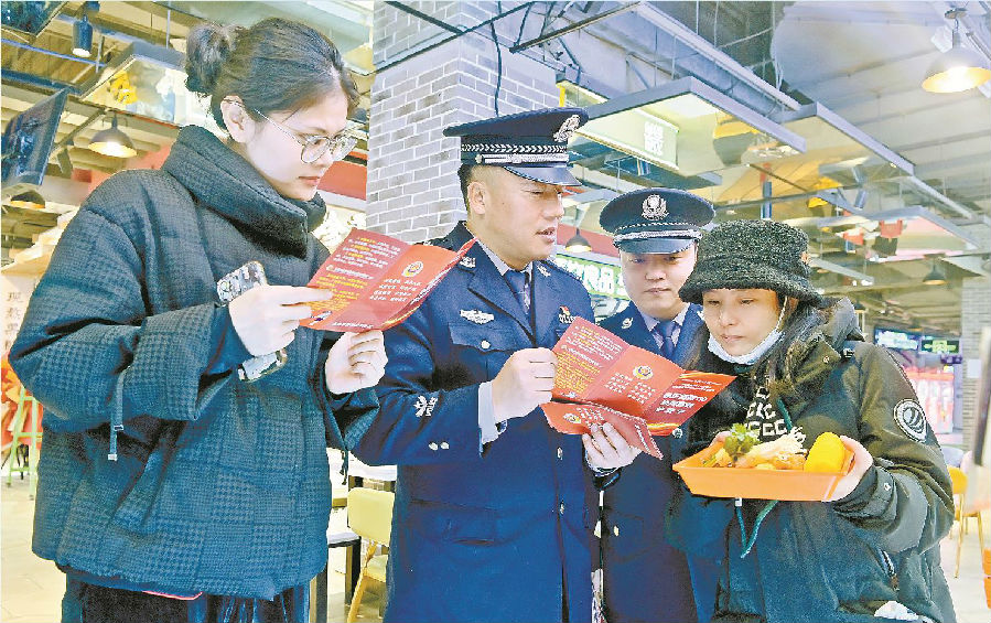 1月9日,乌鲁木齐市公安局高新区(新市区)分局钻石城派出所副所长王江(左二)向过往群众讲解110报警受理范围。