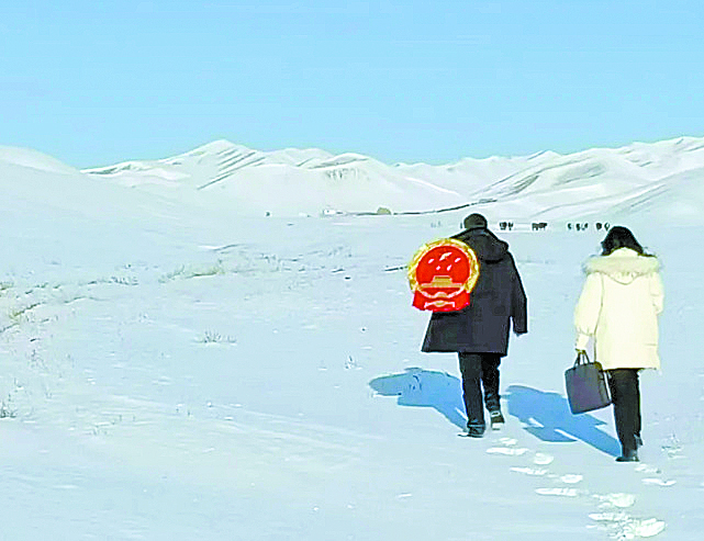 叶尔肯背着国徽与书记员到冬窝子寻找被告。 受访单位供图