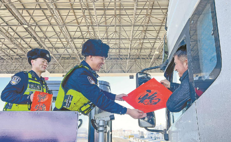 1月14日,新疆出入境边防检查总站阿勒泰边境管理支队塘巴勒边境检查站民警为进出边境管理区的旅客送福字。