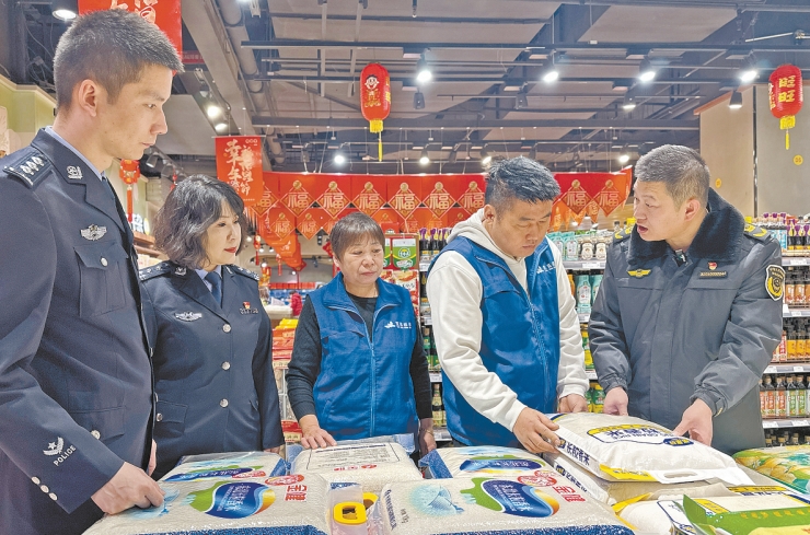 1月17日,乌鲁木齐市公安局食品药品环境犯罪侦查分局联合乌市市场监督管理局、各区公安分局对全市超市、农贸市场开展节前食品安全联合检查,以节前消费量大的肉制品、米面油、烟酒等为重点,查看散装食品标签标识、畜禽蛋等食品索证索票落实情况,规范食品经营者进货渠道,守护群众“舌尖上的安全”。图为联合检查组在德汇万达超市检查袋装大米。