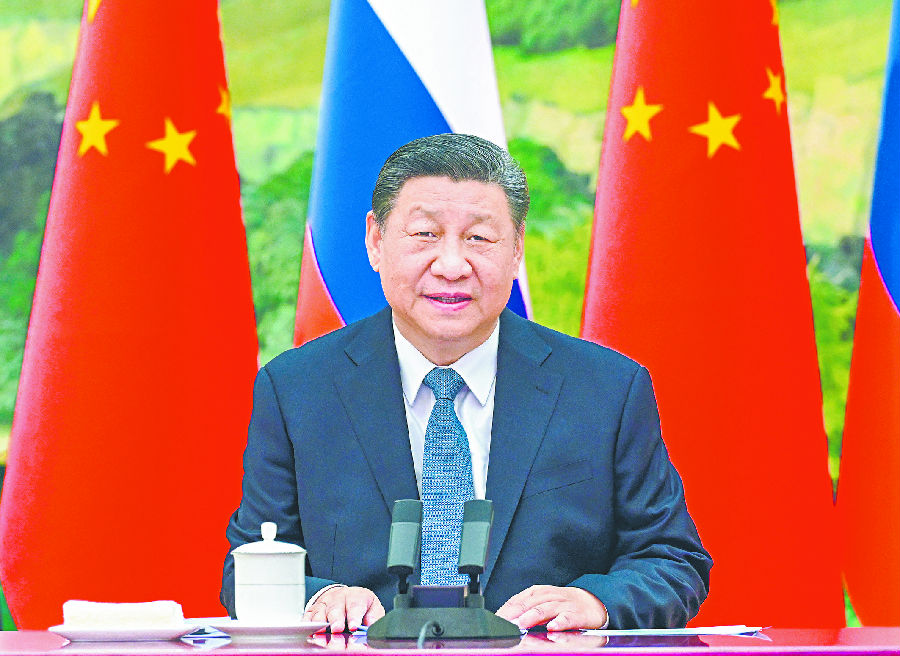 1月21日下午,国家主席习近平在北京人民大会堂同俄罗斯总统普京举行视频会晤。 新华社记者 饶爱民 摄