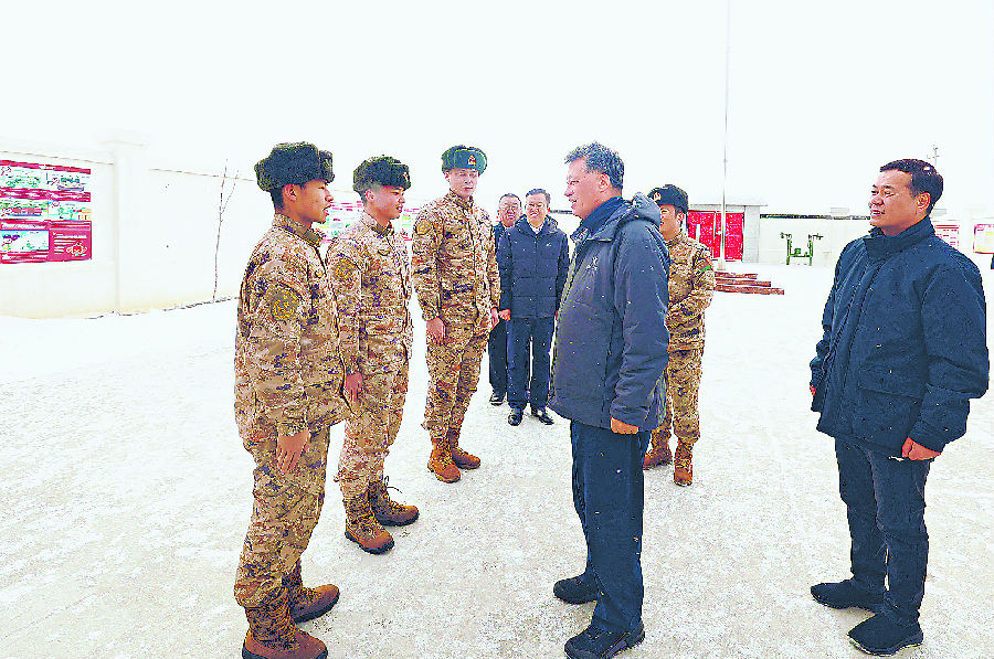 春节假期期间,自治区党委书记马兴瑞来到阿勒泰地区,深入工厂企业、项目现场、边境口岸等地调研,看望慰问一线干部职工。这是马兴瑞在塔克什肯口岸国门前哨班,看望慰问一线官兵。 张涛 摄