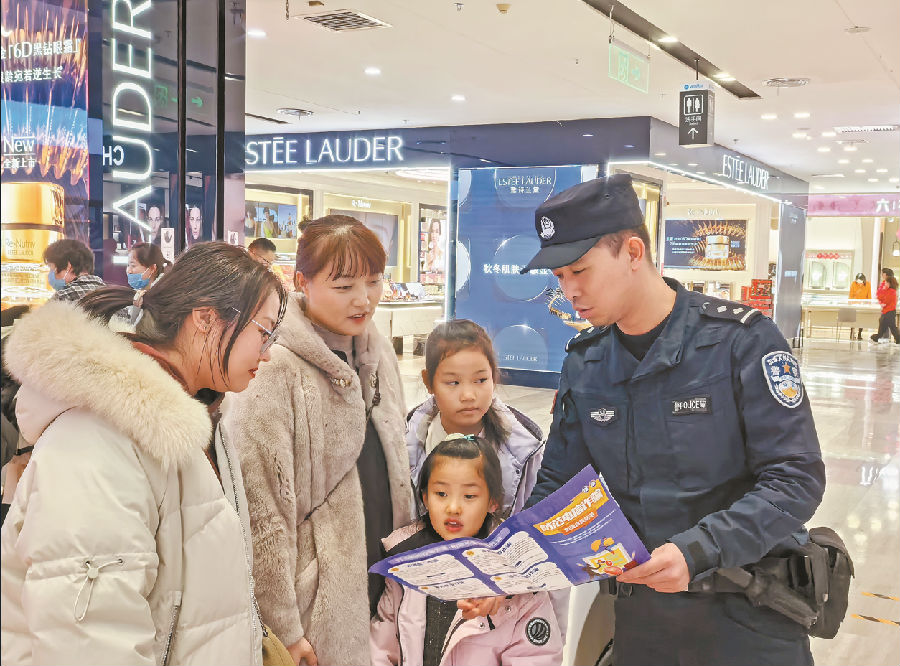 2月4日,乌鲁木齐市公安局特警七支队民警在汇嘉时代北京路购物中心向群众宣传反诈知识。