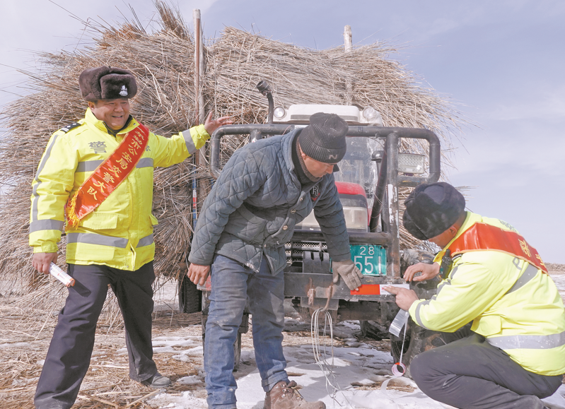 图为民警为运输芦苇的拖拉机粘贴反光贴。 严万海 摄