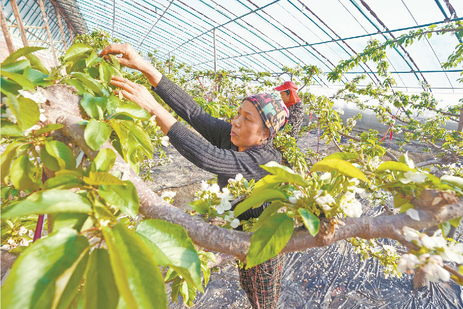 2月5日,在兵团第十师188团的果蔬大棚里,种植户在管护樱桃树。眼下,该团果蔬大棚里种植的樱桃树花开正艳,种植户们忙着施肥、授粉,大棚里一派繁忙景象。近年来,该团依托城郊地缘优势,积极发展樱桃、树莓及草莓等特色种植业,带动职工群众增收致富。 李正虎 摄