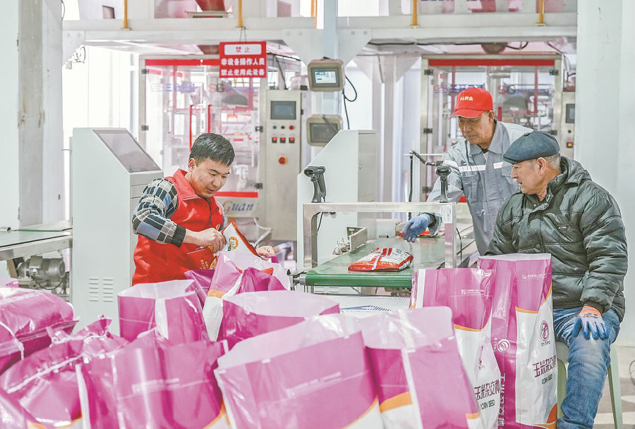 图为2月27日,乌苏市西城街道组织党员志愿者来到新疆杉禾种业有限公司生产车间,协助工人打包,确保种子及时供应市场。