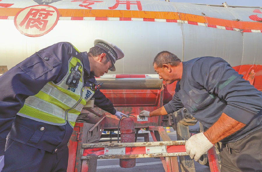 2月26日,博州公安局交警支队五台高等级公路交警大队民警检查车辆消防设备。 博州公安局交警支队供图