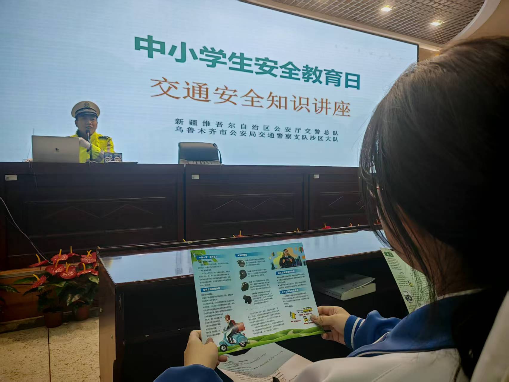 3月23日,在第30个全国中小学生安全教育日前夕,乌鲁木齐市公安局交警支队沙区大队西北路中队宣传民警走进乌鲁木齐市第41中学,开展“民警进校园,安全伴成长”主题活动。