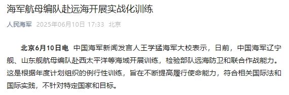 A+ | a中国海军新闻发言人王学猛海军大校表示,日前,中国海军辽宁舰、山东舰航母编队赴西太平洋等海域开展训练,检验部队远海防卫和联合作战能力。这是根据年度计划组织的例行性训练,旨在不断提高履行使命能力,符合相关国际法和国际实践,不针对特定国家和目标。