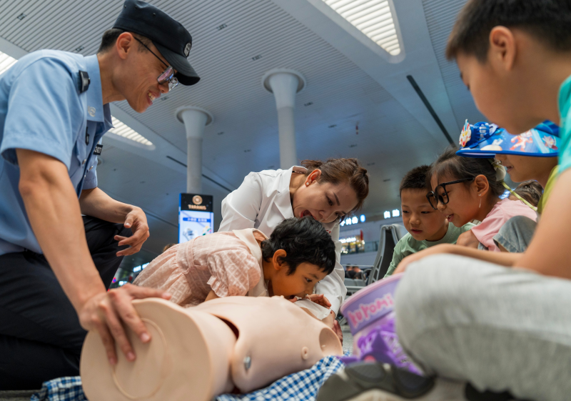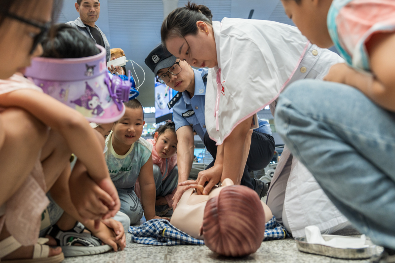 活动现场,民警与医务工作者通过理论讲解和实操演示,向青少年群体、学生旅客系统传授心脏骤停、中暑等急症的识别要点与“急救黄金4分钟”的核心技能。民警与医护人员协同演示胸外按压标准流程,并现场邀请学生体验实操。同时针对暑期青少年用眼健康,开设眼部义诊专区,为现场旅客特别是学生群体免费筛查常见眼部疾病,“面对面”讲解电子产品科学使用时长、护眼穴位按摩技巧等实用知识,帮助青少年养成“健康用眼生物钟”。