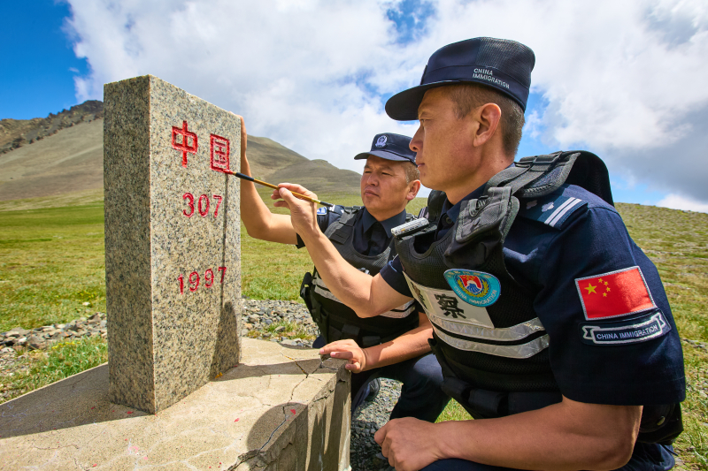 民警为界碑描红。通讯员 芦胜磊摄