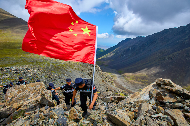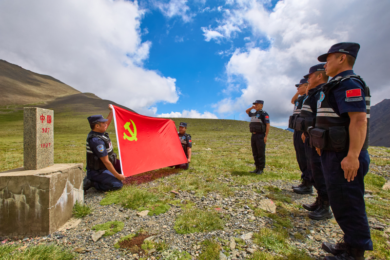 6月28日,新疆出入境边防检查总站博州边境管理支队查干屯格边境派出所民警们组成巡边踏查分队,采取车巡、马巡、步巡相结合的方式,开展踏查工作,并在边境一线的界碑旁重温入党誓词,用实际行动践行铮铮誓言。