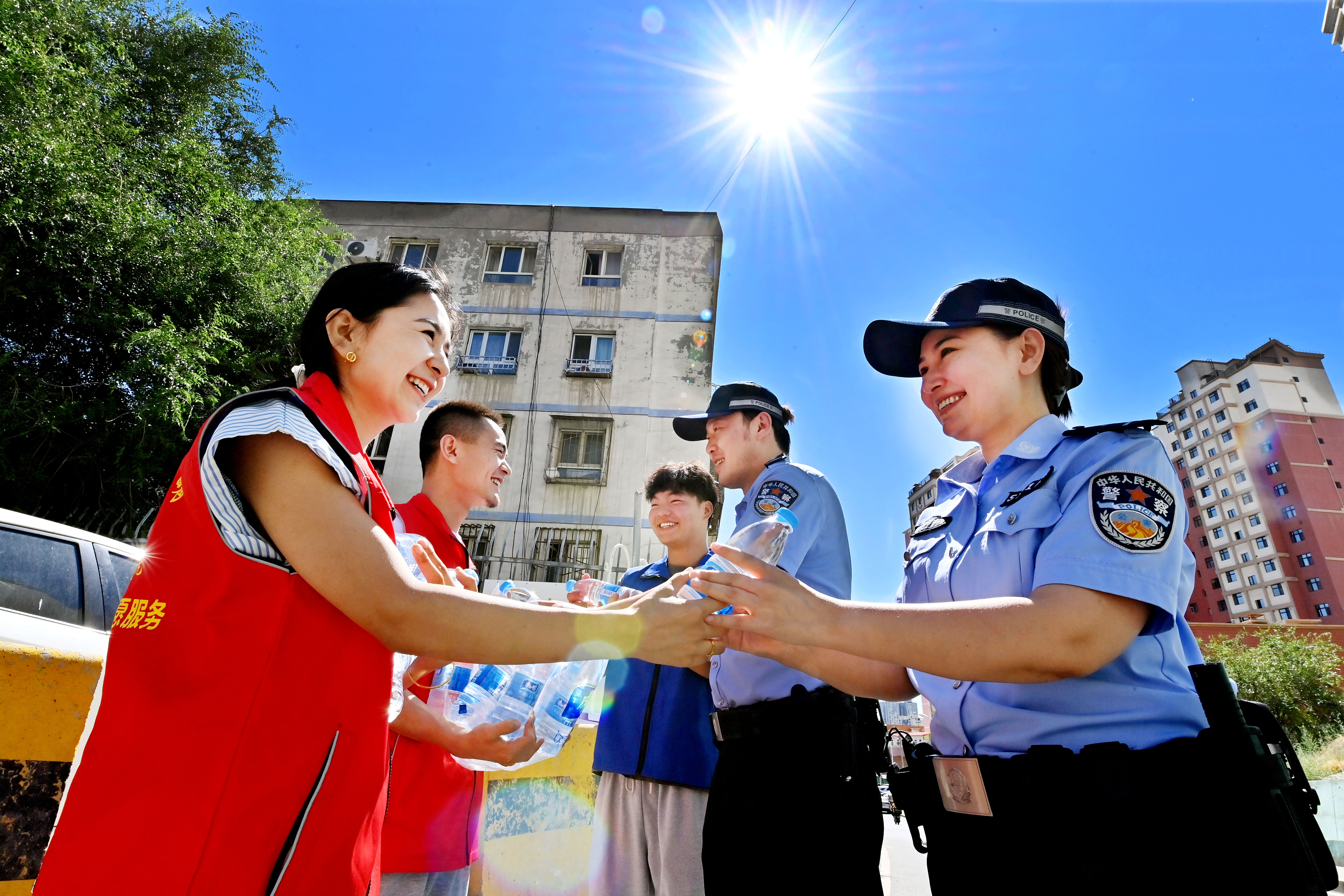 7月8日,社区干部为正在执勤的乌市公安局沙区分局碾子沟派出所的民辅警送上冰镇矿泉水。石榴云/新疆法治报记者 单坤摄