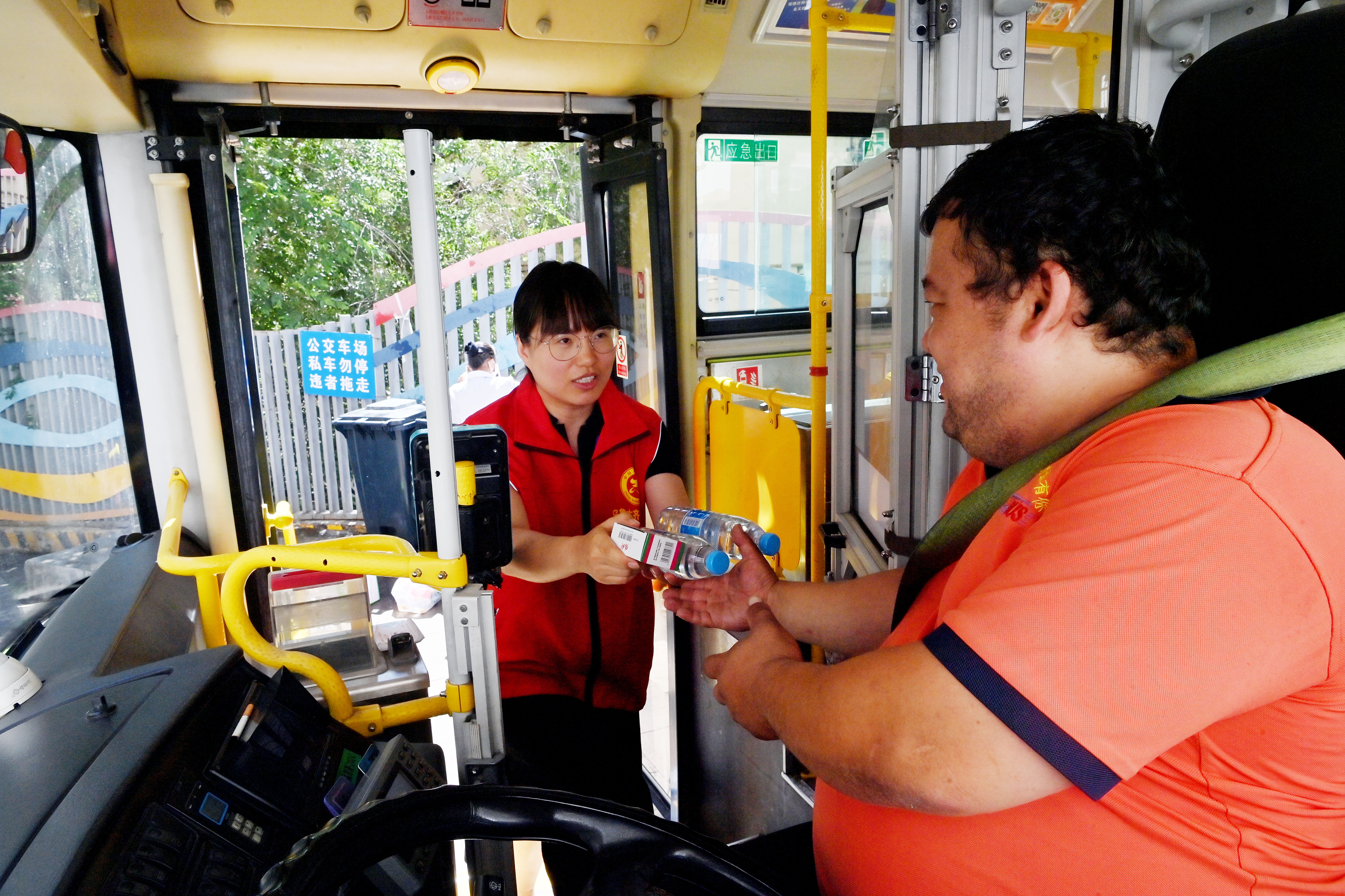 7月8日,社区干部为正在休息的公交车驾驶员送上饮品和防暑药品。石榴云/新疆法治报记者 单坤摄