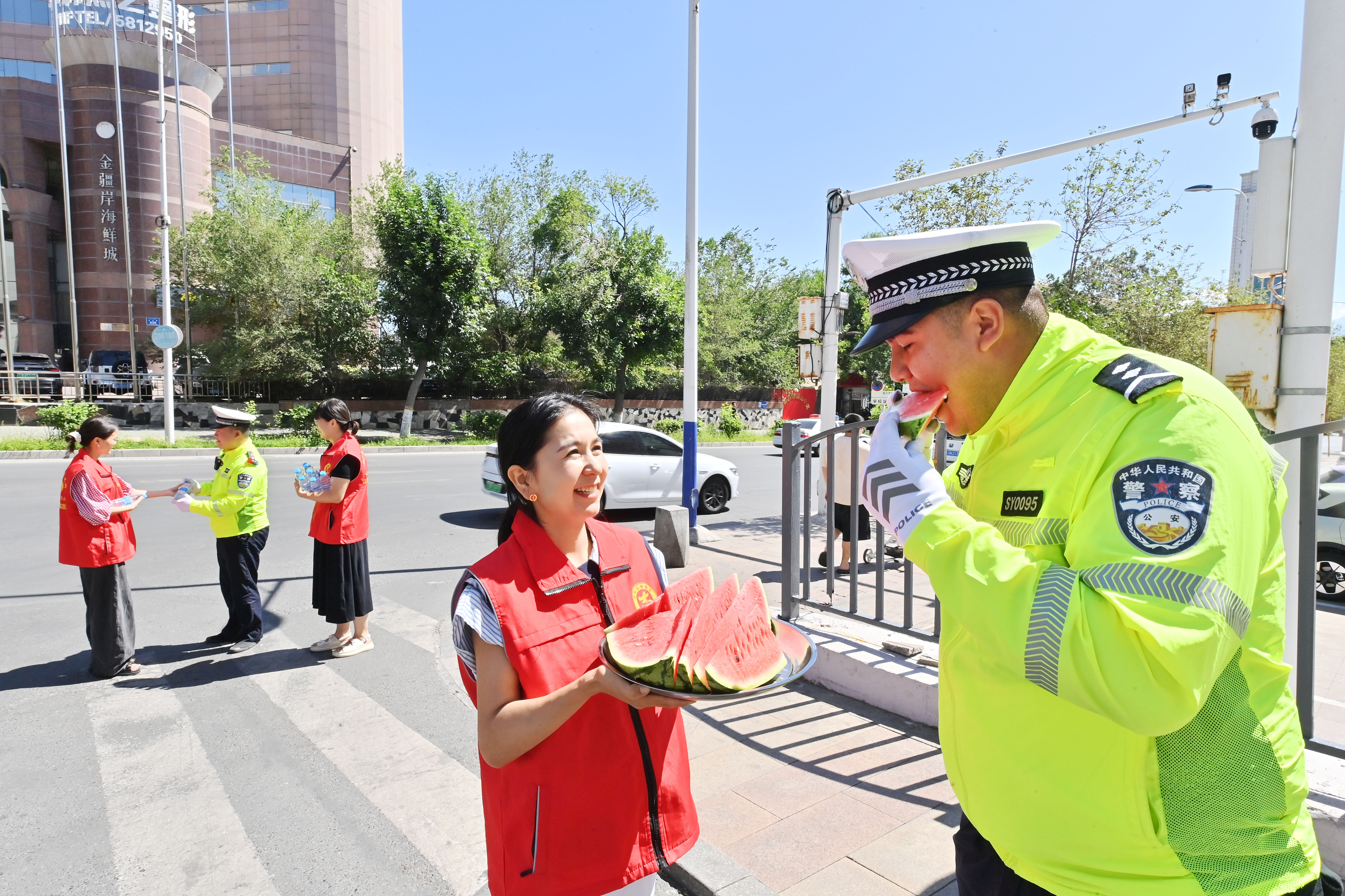 7月8日,社区干部为在路边休息的乌市公安局交警支队沙区大队长江路中队的辅警送上西瓜。石榴云/新疆法治报记者 单坤摄