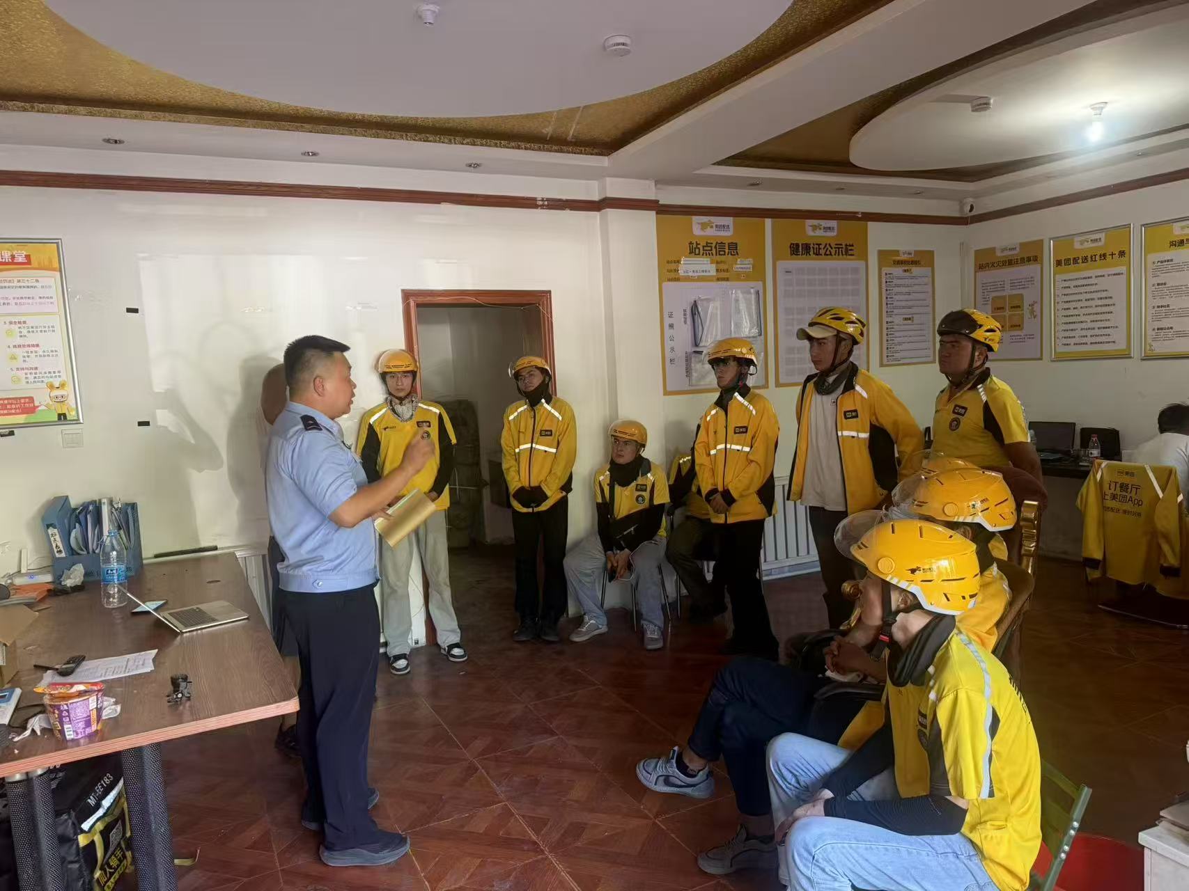 7月31日,乌鲁木齐市公安局水磨沟区分局新民路街道派出所民警向外卖骑手普及交通安全知识。通讯员 彭金楠摄