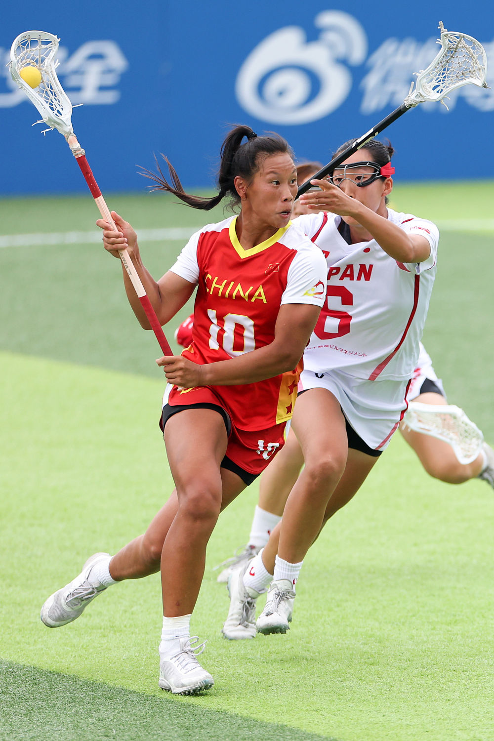A+ | a“小心身后,向左面转移……”18岁小将贾昭润在队友的呼喊中快速折返变线,精准地用球网接住球后用力抛出弧线,组织进攻的娴熟动作赢得了现场观众的欢呼。在呼喊声、球杆碰撞声与观众的呐喊声中,2025年成都世运会女子六人制棍网球比赛在成都七中东部学校田径场上演着“速度与激情”的对抗。
