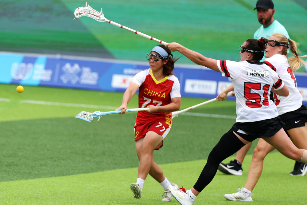 本届世运会上,棍网球比赛在长70米、宽36米的人造草地上举行,一场比赛由4节组成,每节8分钟,球员的球杆顶端带有网兜,球员通过抛击小球来传球或射门。棍网球比赛因其节奏快、对抗激烈而著称,攻防转换迅速,球速最高可达160公里每小时,远超许多其他球类运动,因此运动员需佩戴护目镜和护齿等护具。