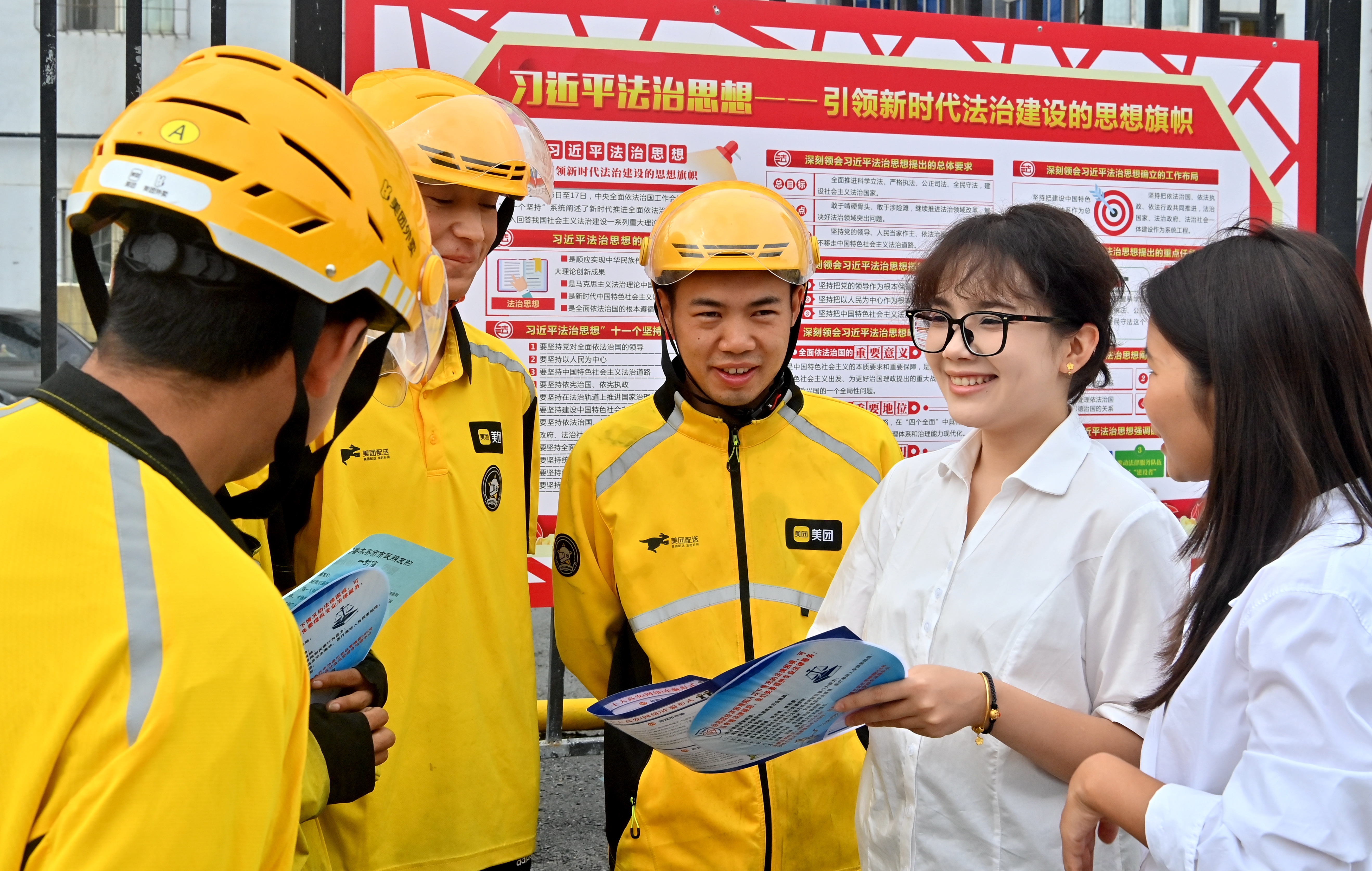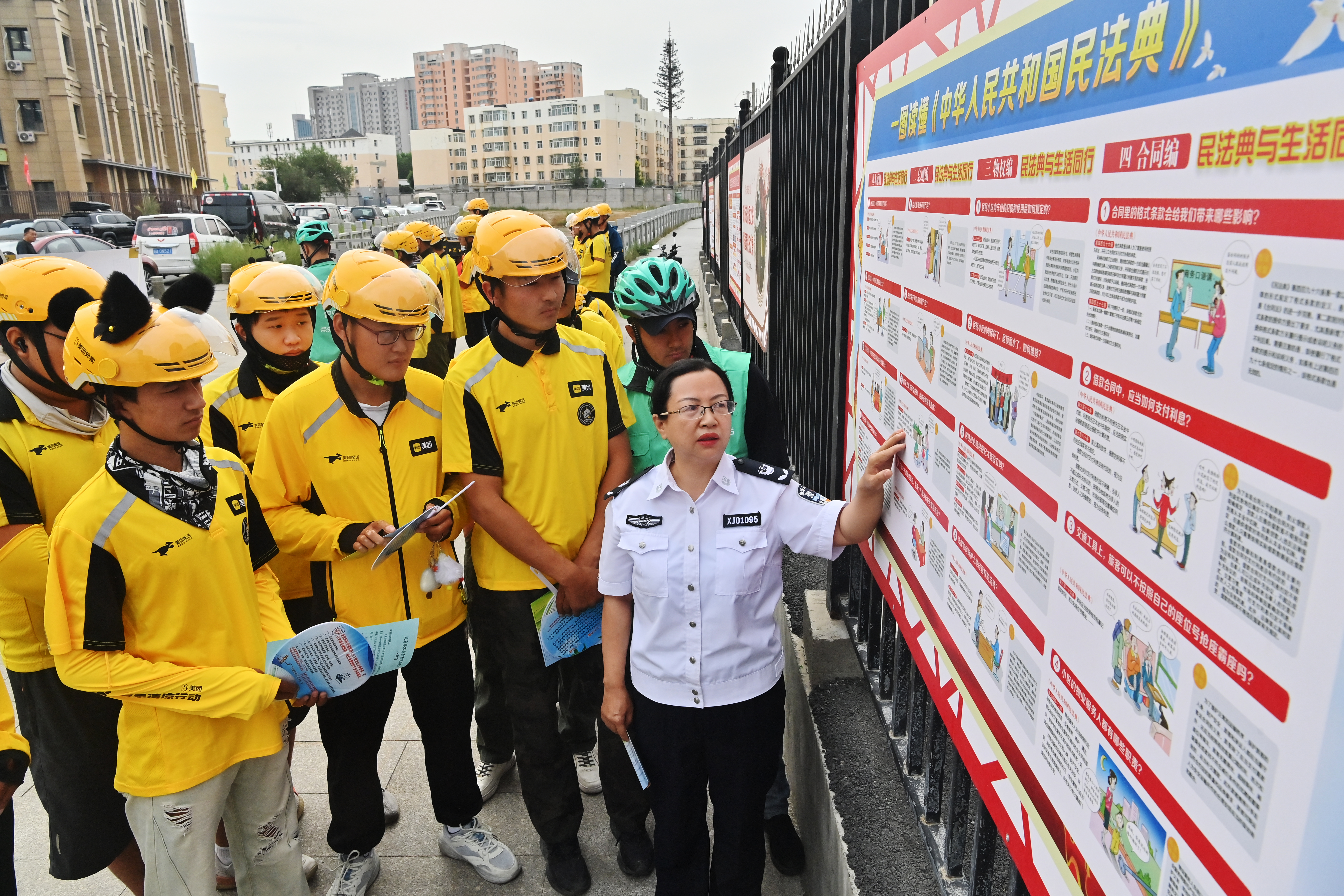 乌市沙区司法局友好北路司法所与新疆旭光律师事务所工作人员现场发放民法典及劳动权益保护手册等宣传资料,并针对骑手关心的劳动合同签订、工伤认定、薪酬纠纷等问题,提供一对一法律咨询服务。