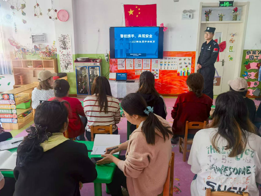 新学期开学在即,为全面提升幼儿园教职工安全防护和应急处置能力,新疆出入境边防检查总站哈密边境管理支队盐池边境派出所主动作为,组织担任该园法治副园长的民警吕衡走进盐池镇中心幼儿园,为全体教职工开设“开学安全综合课”,通过“理论授课+模拟演练”提升安全履职能力。
