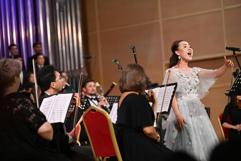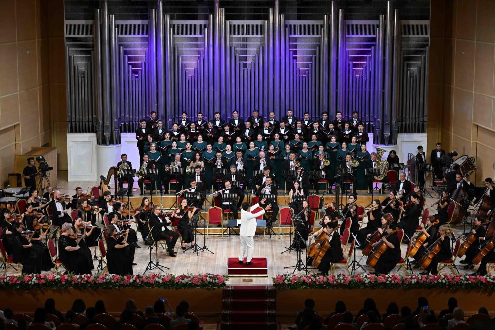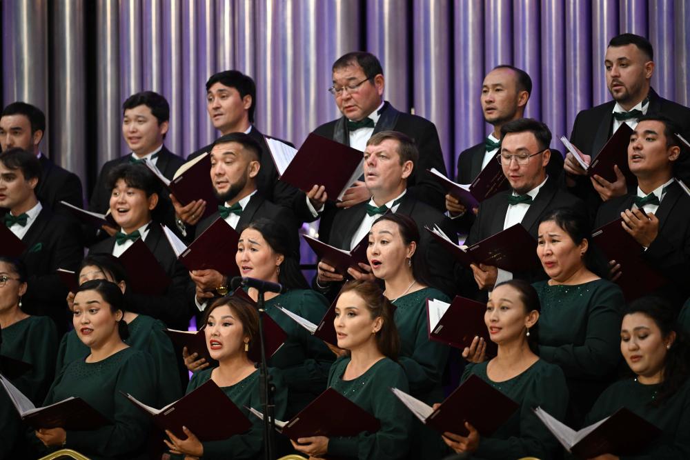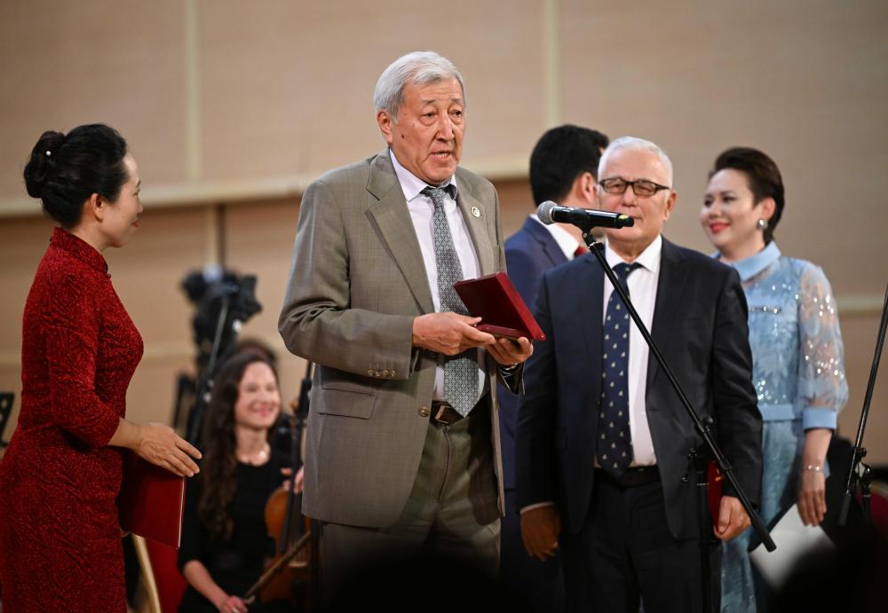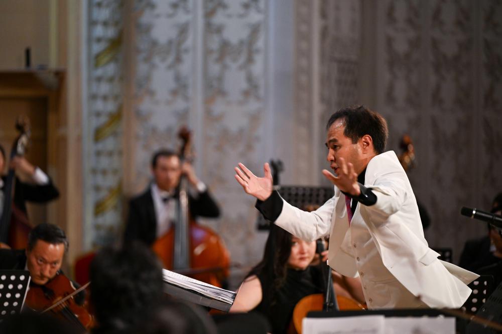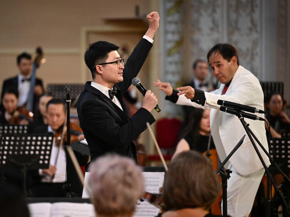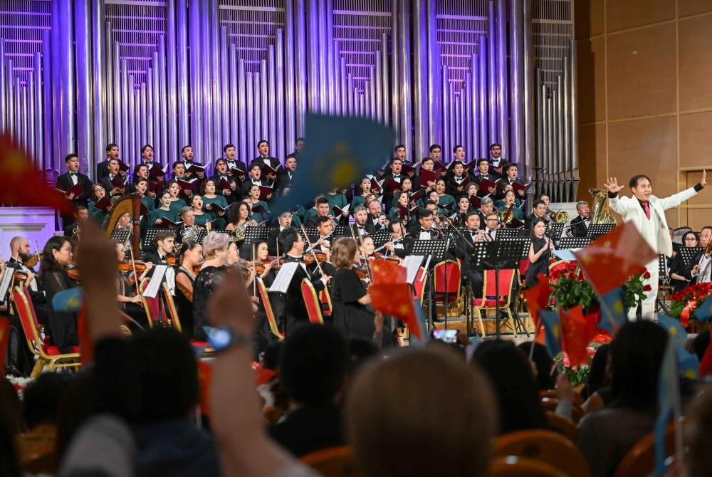 A+ | a纪念中国人民抗日战争暨世界反法西斯战争胜利80周年、纪念冼星海诞辰120周年音乐会9月3日晚在哈萨克斯坦阿拉木图的国立江布尔音乐厅举行。阿市政府、外交领事机构、老兵协会、当地华侨华人、中资机构、留学生等各界人士近600人出席。哈国立拜卡达莫夫合唱团、阿布德拉舍夫国立模范交响乐队共同演绎《黄河大合唱》《阿曼盖尔德》等作品。观众们自发挥舞中哈两国国旗,齐声高唱歌曲,现场气氛澎湃激昂。