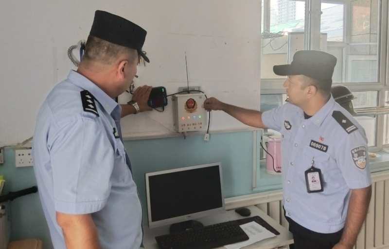 伊犁河路街道派出所民警检查伊宁市第二中学校园报警器是否完好。通讯员 段亚平摄