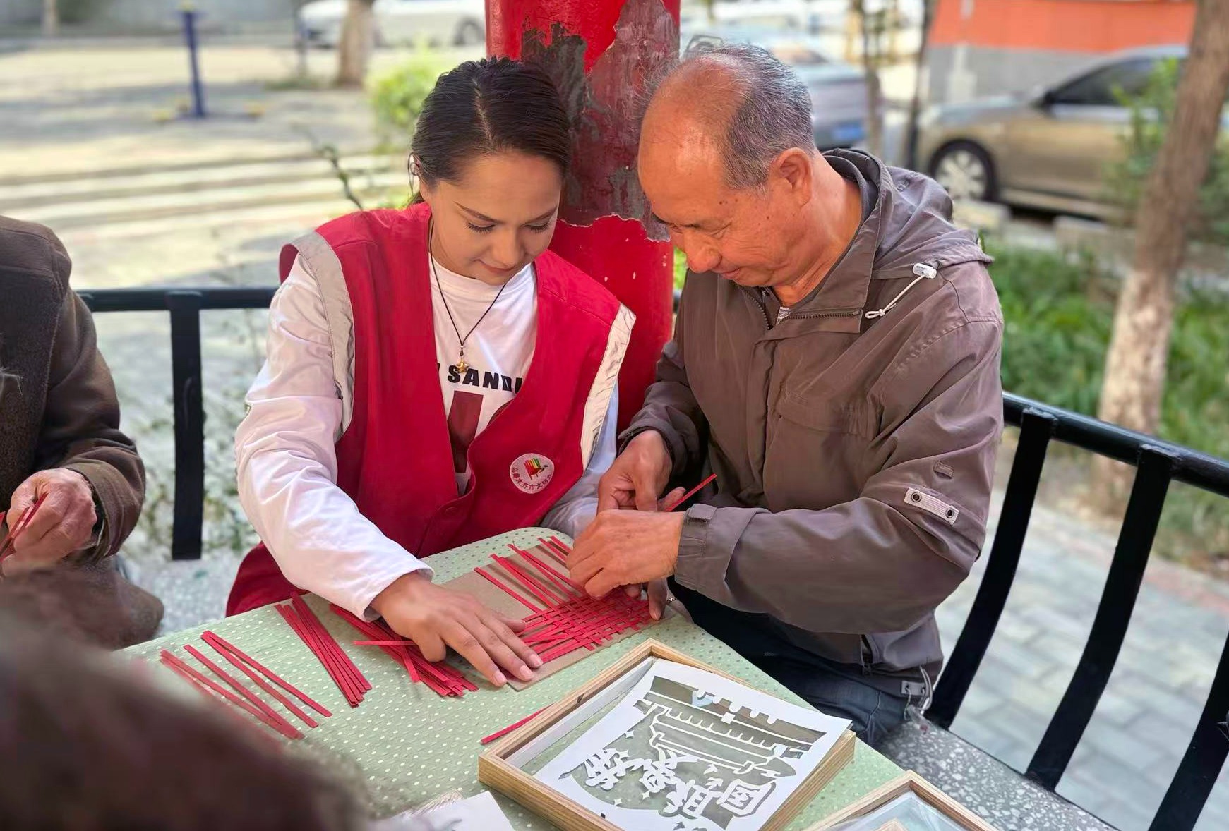 活动现场,志愿者与群众一起创作竹编画。石榴云/新疆法治报记者 龚彦晨摄