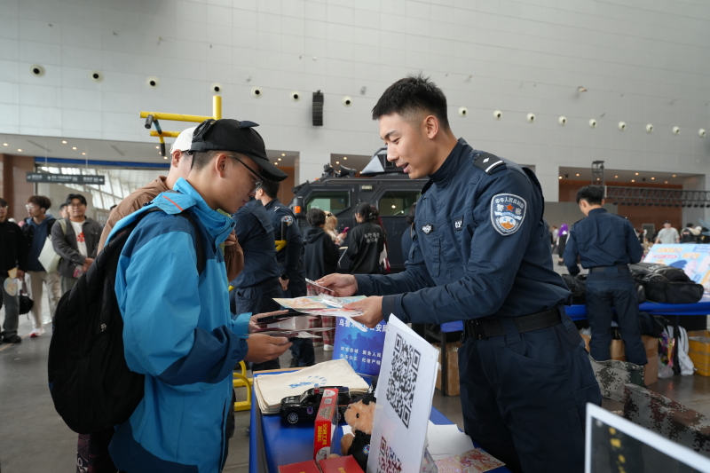 10月2日,在新疆国际会展中心12号馆,乌鲁木齐市公安局特警特战支队民警向群众普法。石榴云/新疆法治报记者 龚彦晨摄