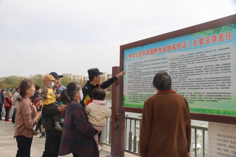 在每天的巡逻途中,民辅警身兼数职,既是执法者,也是宣传员、劝导员,闲暇时,他们和志愿者还会变成“生态讲解员”,游客较多时,他们开展“岸边微课堂”,一边向大家讲解天鹅保护知识,一边发放反诈宣传单。
