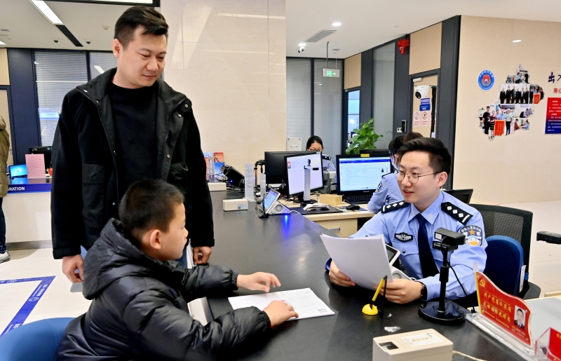11月18日,乌鲁木齐市公安局出入境管理支队(国际合作局)民警在益民大厦办证大厅为小朋友办理出入境手续。石榴云/新疆法治报记者 单坤摄