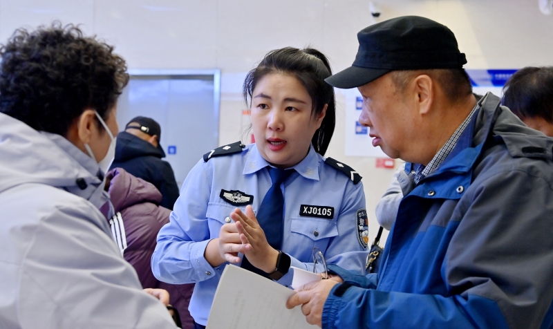 11月18日,乌鲁木齐市公安局出入境管理支队(国际合作局)辅警在益民大厦办证大厅解答群众提出的问题。石榴云/新疆法治报记者 单坤摄
