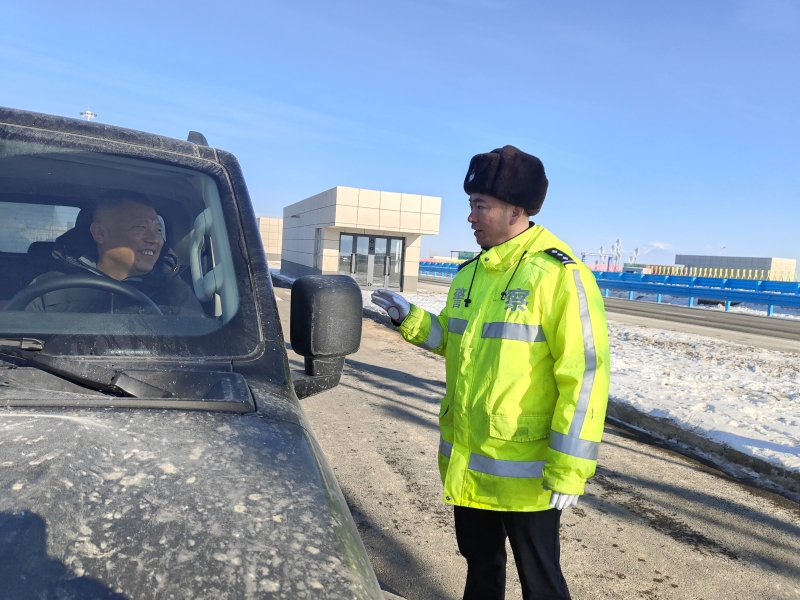 1月1日,民警对准备驶入乌尉高速的车辆驾驶人开展安全提示。乌鲁木齐市公安局交管支队供图