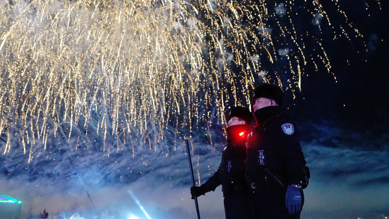 “5、4、3、2、1,新年快乐!”2025年12月31日晚,在第十师北屯市,“西北之北 冰城北屯”第五届“冰城”文化旅游节开幕式暨跨年狂欢夜在师市玉带河广场拉开帷幕,文艺表演以及无人机秀与烟花秀交织的盛宴,沸腾了全城。烟花之下,师市公安民辅警或步巡或定点值守,既引导群众有序进场,又插空回答“哪里是最佳观赏区”“走哪边最近”等问题,时不时根据接收的指令寻找“不见的孩子”“急救突然晕倒的群众”。