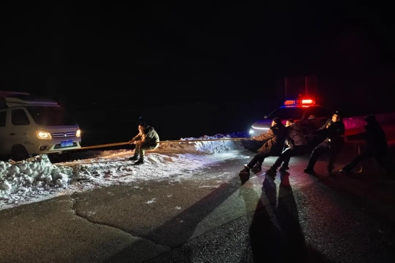 2025年12月31日深夜,第四师昭苏垦区公安局七十六团文化广场便民警务站民辅警协助车辆被困群众脱困。受访单位供图