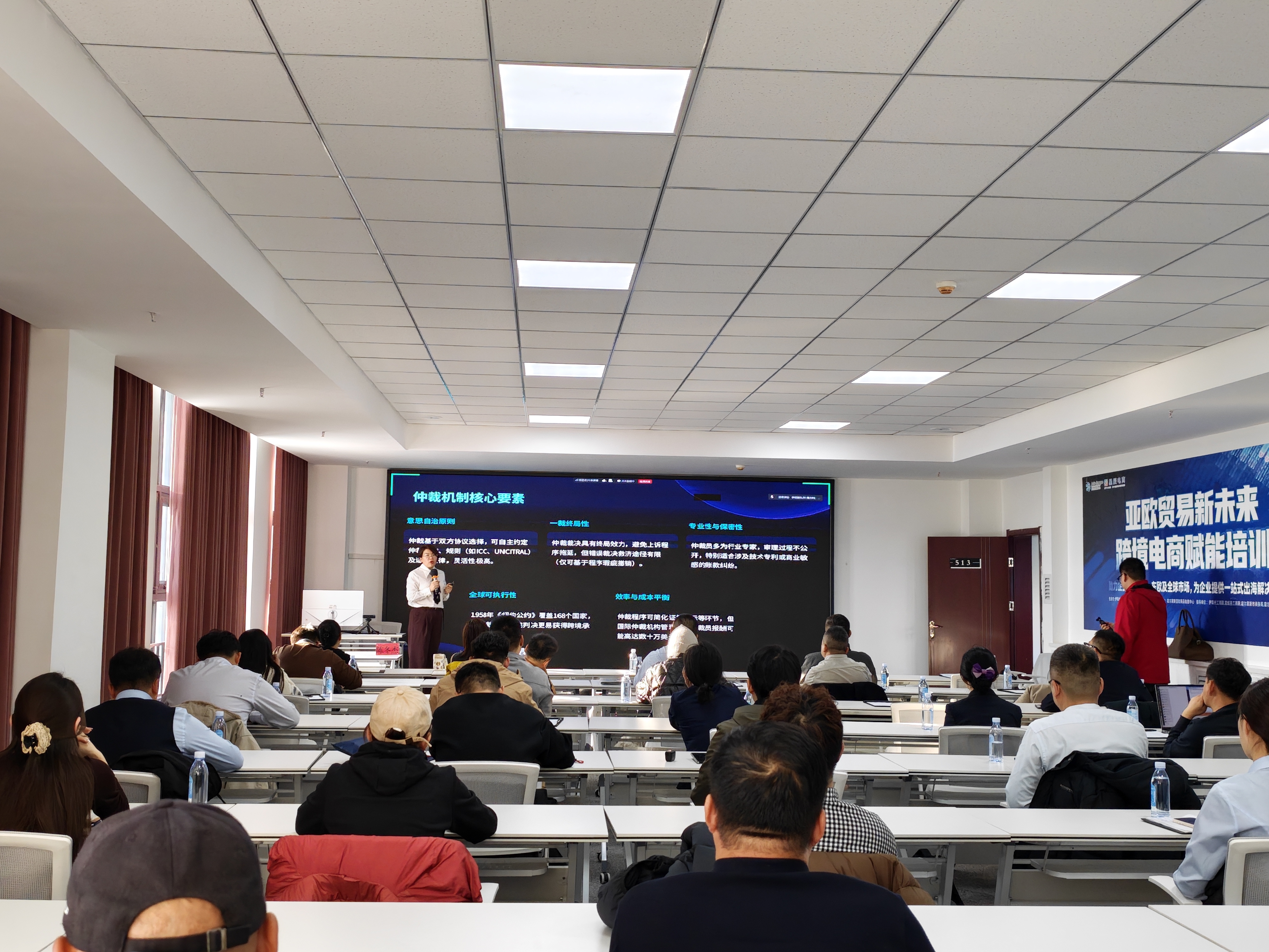新疆法制报网讯 1月13日下午,霍尔果斯驿路国际法务区与霍尔果斯市国际贸易商会联合举办的“法商协同”课程第二期在亚欧商品集散中心开讲。本期课程以“涉外商事争议解决途径与跨境账款回收实务”为主题,邀请新疆云德律师事务所主任陈冬杰授课,来自乌鲁木齐、霍尔果斯、喀什三大自贸片区的企业家参与培训。