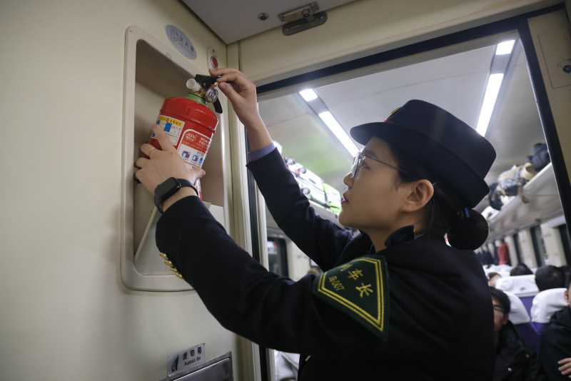 王爽在列车上检查消防设施。 通讯员 杨佳闻摄