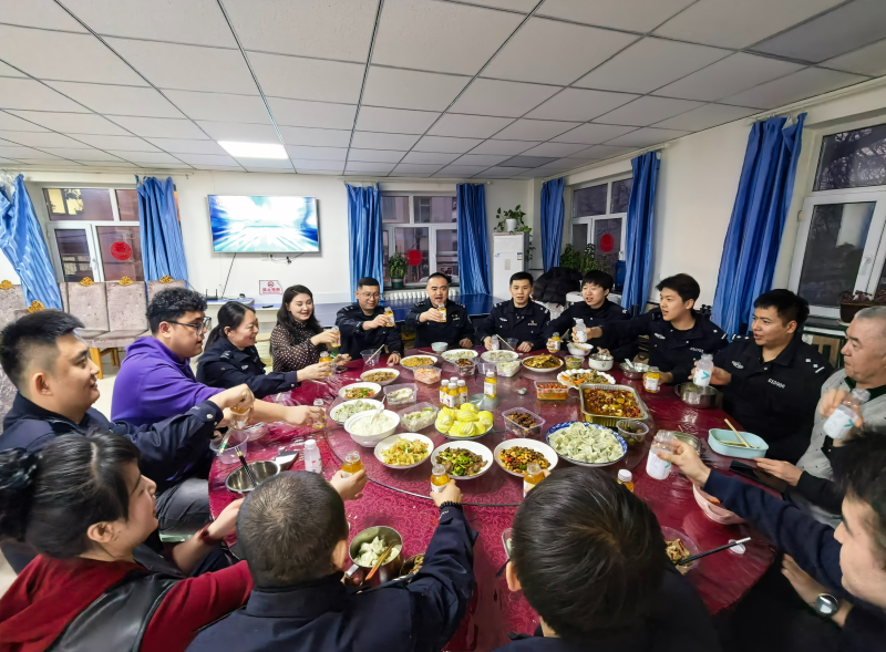 回到派出所时,已是晚饭时间。民辅警和家属一起包的饺子刚好出锅,所长高峰高声招呼大家落座开饭。与此同时,辖区内各个警务站、警务室里,热气腾腾的饺子、香气四溢的大盘鸡也陆续端上了桌,一桌桌年夜饭简单却暖心。