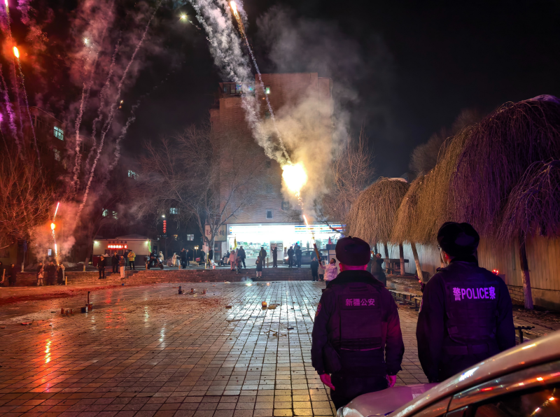 平顶山街道派出所民辅警在汇嘉园小区烟花爆竹燃放点执勤。石榴云/新疆法治报记者 龚彦晨摄