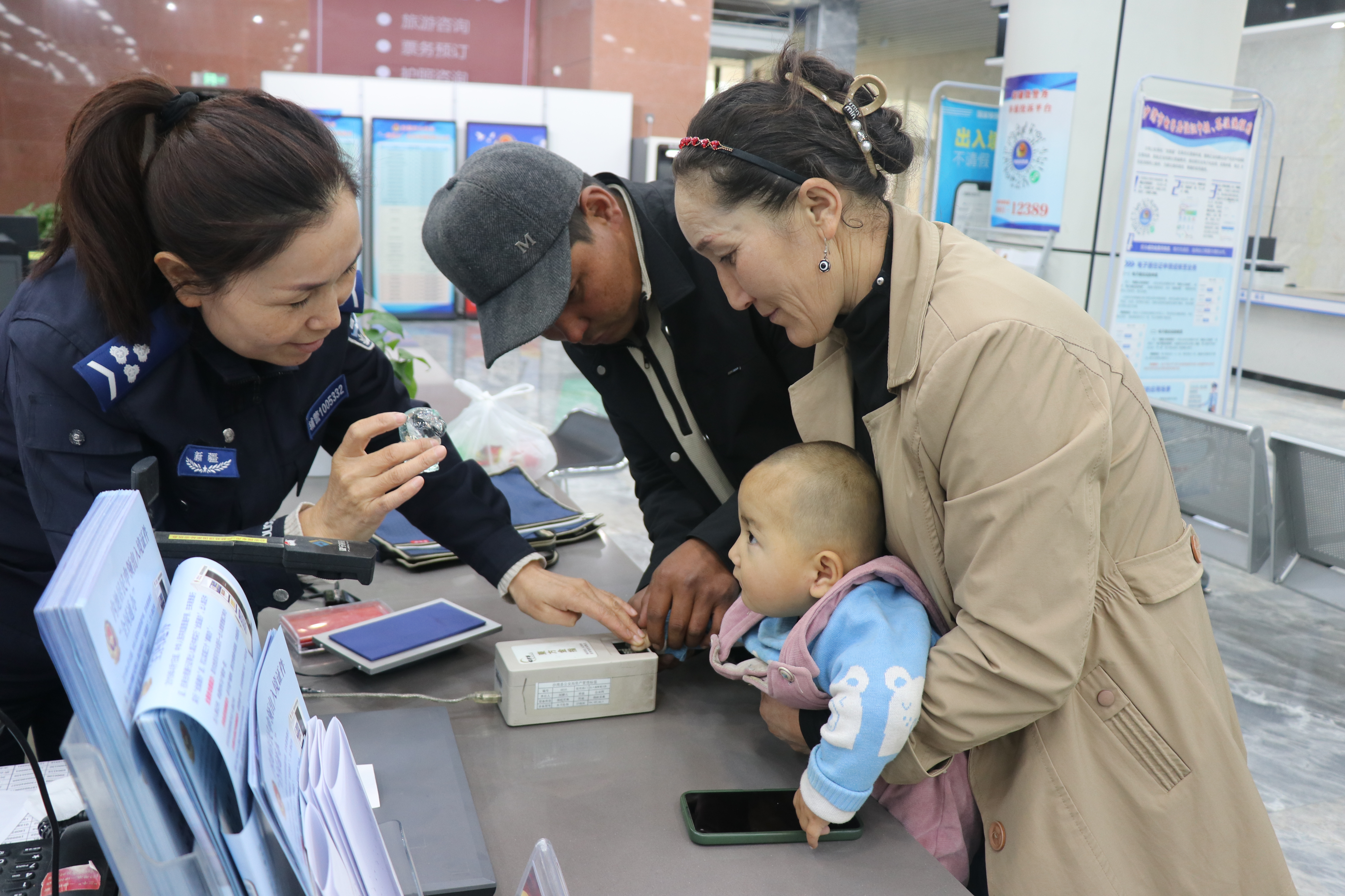 新疆法制报网讯 近日,沙湾市政务服务中心出入境窗口上演暖心一幕:一位半岁婴儿来办理护照,因年龄小,注意力难以集中,证件照多次采集均未成功,父母十分焦急。沙湾市公安局出入境窗口民警以专业素养和温情服务,用玩具吸引注意力,耐心帮忙采集,并贴心安排家长从旁安抚,最终成功完成信息采集。